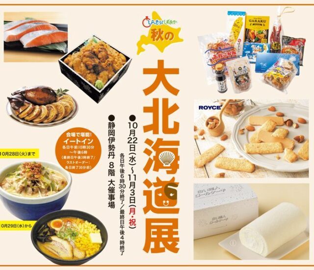 静岡伊勢丹で人気のグルメイベント「秋の大北海道展2025」が、2025年10月22日(水)〜11月3日(月・祝)の期間限定で開催!北海道の人気ラーメンやスイーツ、海の幸、銘菓が一堂に会する大人気の物産展です。旭川「らーめん山頭火」や札幌「らーめん四代目いちまる」の限定イートインをはじめ、ジェラテリアRimoのジェラートやロイズ、六花亭など定番スイーツも登場。さらに、アプリクーポン特典や先着サービスも盛りだくさん!旬の味覚を満喫できる秋の食フェスをお見逃しなく。