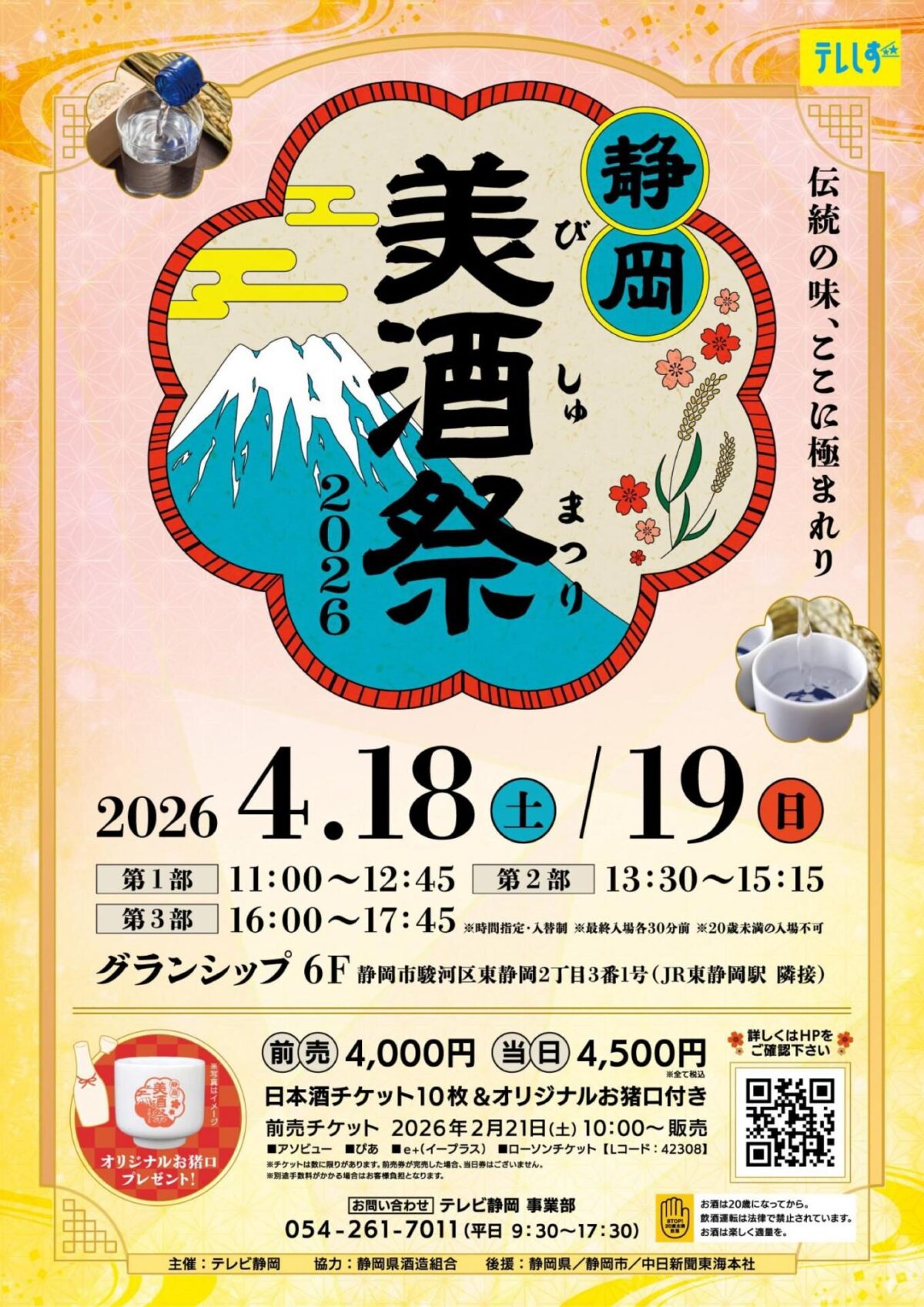 静岡県静岡市で4月に開催される日本酒イベントとして、グランシップ 6階 交流ホール・展示ギャラリーを会場に実施される静岡美酒祭 2026は、静岡県の20蔵の日本酒を飲み比べできるイベントです。