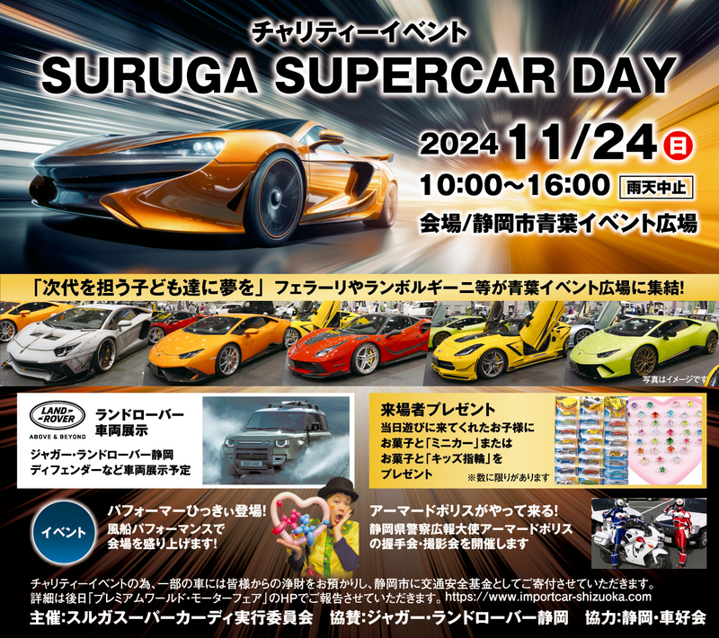 「SURUGA SUPERCAR DAY 2024」は、フェラーリやランボルギーニなどのスーパーカーが静岡市青葉イベント広場に集結する、チャリティーイベントです。「次代を担う子ども達に夢を」をテーマに、イベントの収益の一部は静岡市交通安全基金に寄付されます。お子様向けの来場プレゼントや、静岡県警察広報大使「アーマードポリス」との握手会・撮影会も実施され、バルーンアートなどのパフォーマンスも楽しめます。大人から子どもまで楽しめる特別な1日をぜひお楽しみください。